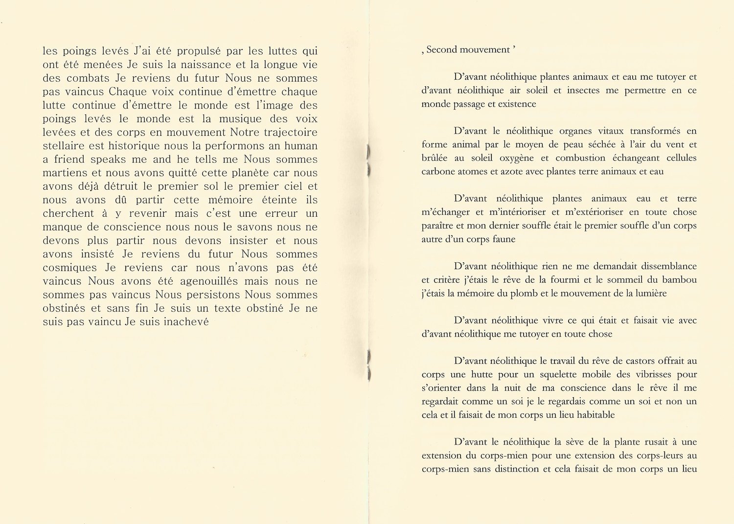Impossessions primitives est l’allégorie d’une danse la plus libre qui soit ; libre car les deux mouvements qui composent le texte sont générés par le degré zéro de l’enchantement. Ils sont les mouvements involontaires qui engendrent sans cesse d’autres mouvements au- dehors et au-dedans d’eux-mêmes et dont le point de départ individuel, l’écriture, appelle des corps : une communauté chorale qui exprime son unité à travers le déploiement d’un phrasé dont l’amplitude est l’anonymat. Expression d’une séparation originelle aussi, Impossessions primitives fait sourdre la langue pour dire notre corporéité la plus tangible.